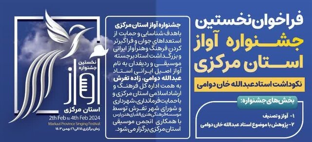 حسین محمودیفر در گفتوگو با ایسنا، اظهار کرد: جشنواره آواز استان مرکزی با هدف شناسایی و حمایت از استعدادهای جوان و فراگیرتر کردن فرهنگ و هنر آواز ایرانی و بزرگداشت استاد برجسته موسیقی و ردیفدان به نام آواز اصیل ایرانی استاد عبداللهخان دوامی به همت اداره کل فرهنگ و ارشاد اسلامی استان مرکزی و با حمایت فرمانداری، شهرداری و شورای اسلامی شهر تفرش توسط یکی از موسسات فرهنگی با همکاری انجمن موسیقی استان مرکزی برگزار میشود.