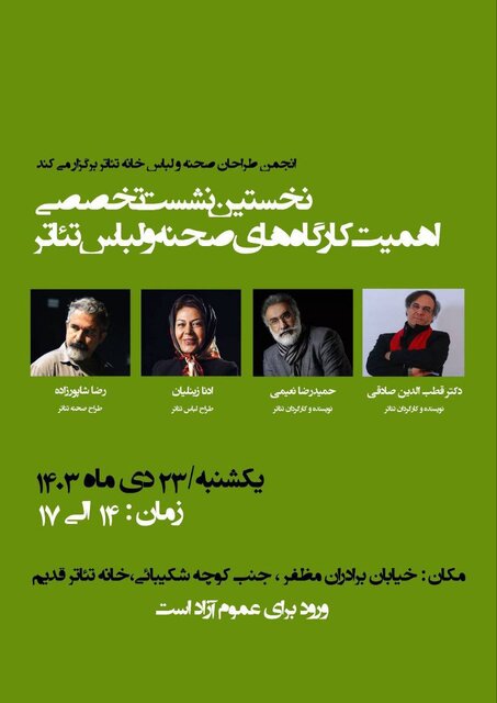 به نقل از روابط عمومی این انجمن، این نشست به کوشش انجمن طراحان صحنه و لباس خانه تئاتر با حضور قطبالدین صادقی، پژوهشگر، نمایشنامهنویس و کارگردان تئاتر، حمیدرضا نعیمی، نمایشنامهنویس و کارگردان، ادنا زینلیان، طراح لباس و رضا شاپورزاده، طراح صحنه تئاتر برگزار میشود.