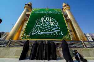 کتیبه عید مبعث توسط خادمان در فراز ایوان طلای حرم مطهر امیرالمومنین نصب شد.