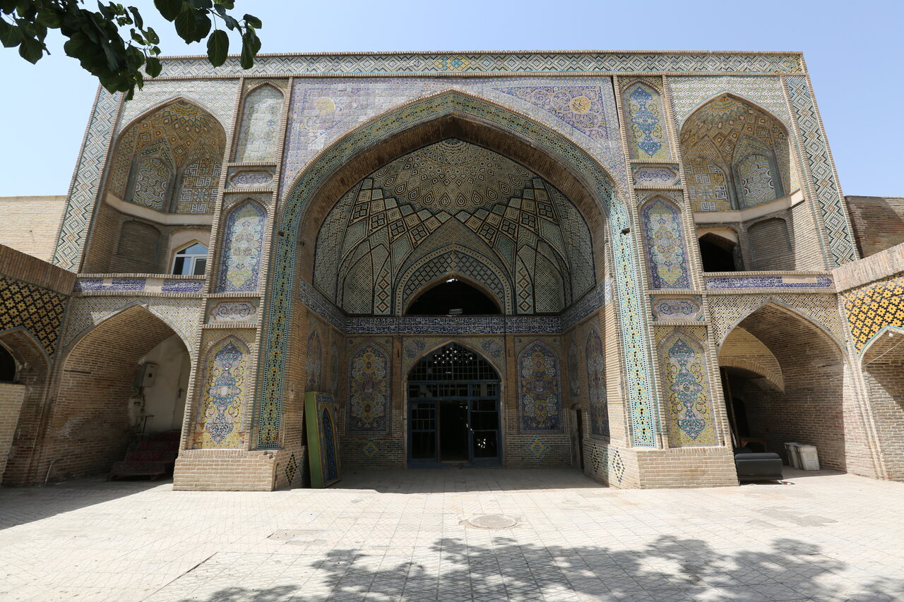 این بنای تاریخی بهدلیل داشتن کاشیهای معقلی (ترکیب کاشی و آجر) کاشی هفترنگ و کاشی معرق، یکی از بناهای خاص دوره قاجار است. از مدرسهای که در ضلع شرقی مسجد قرار داشت تنها یک ایوان با کاشیکاری و معقلی باقی مانده و کلاسهای درس این مدرسه به خانه مسکونی تبدیل شده است.