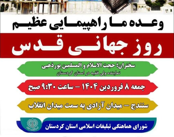 به گزارش خبرنگار مهر، شورای هماهنگی تبلیغات اسلامی استان کردستان اعلام کرد: راهپیمایی روز جهانی قدس روز جمعه هشتم فروردین ماه از میدان آزادی، مسیر پیاده راه فردوسی به سمت میدان انقلاب برگزار میشود.