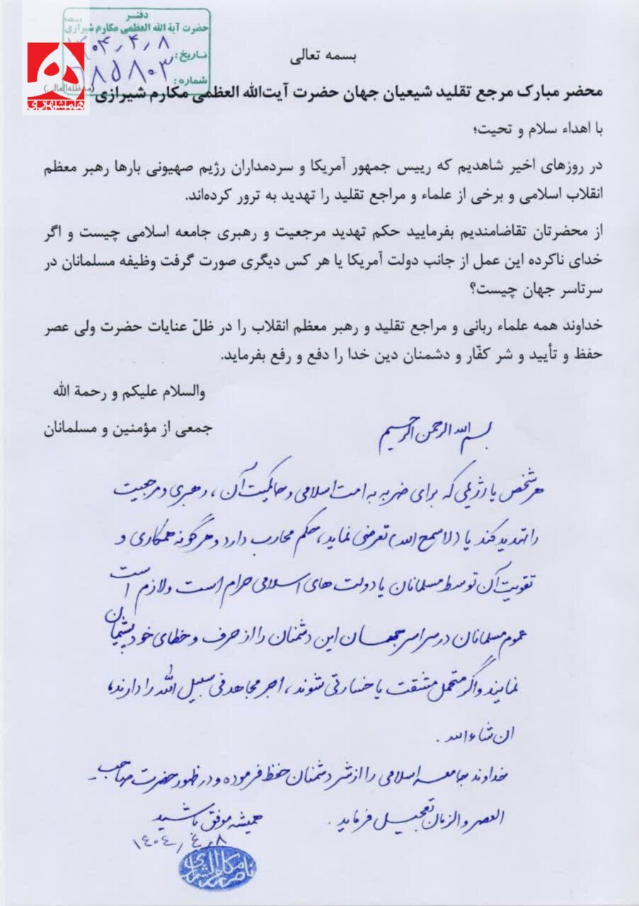 هر شخص یا رژیمی که برای ضربه به امت اسلامی و حاکمیت آن، رهبری و مرجعیت را تهدید کند یا (لاسمح الله) تعرضی نماید حکم #محارب دارد و هر گونه همکاری و تقویت آن توسط مسلمانان یا دولت های اسلامی حرام است و لازم است عموم مسلمانان در سراسر جهان این دشمنان را از حرف و خطای خود پشیمان نمایند و اگر متحمل مشقت یا خسارتی شوند اجر مجاهد فی سبیل الله را دارند، ان شاء الله.