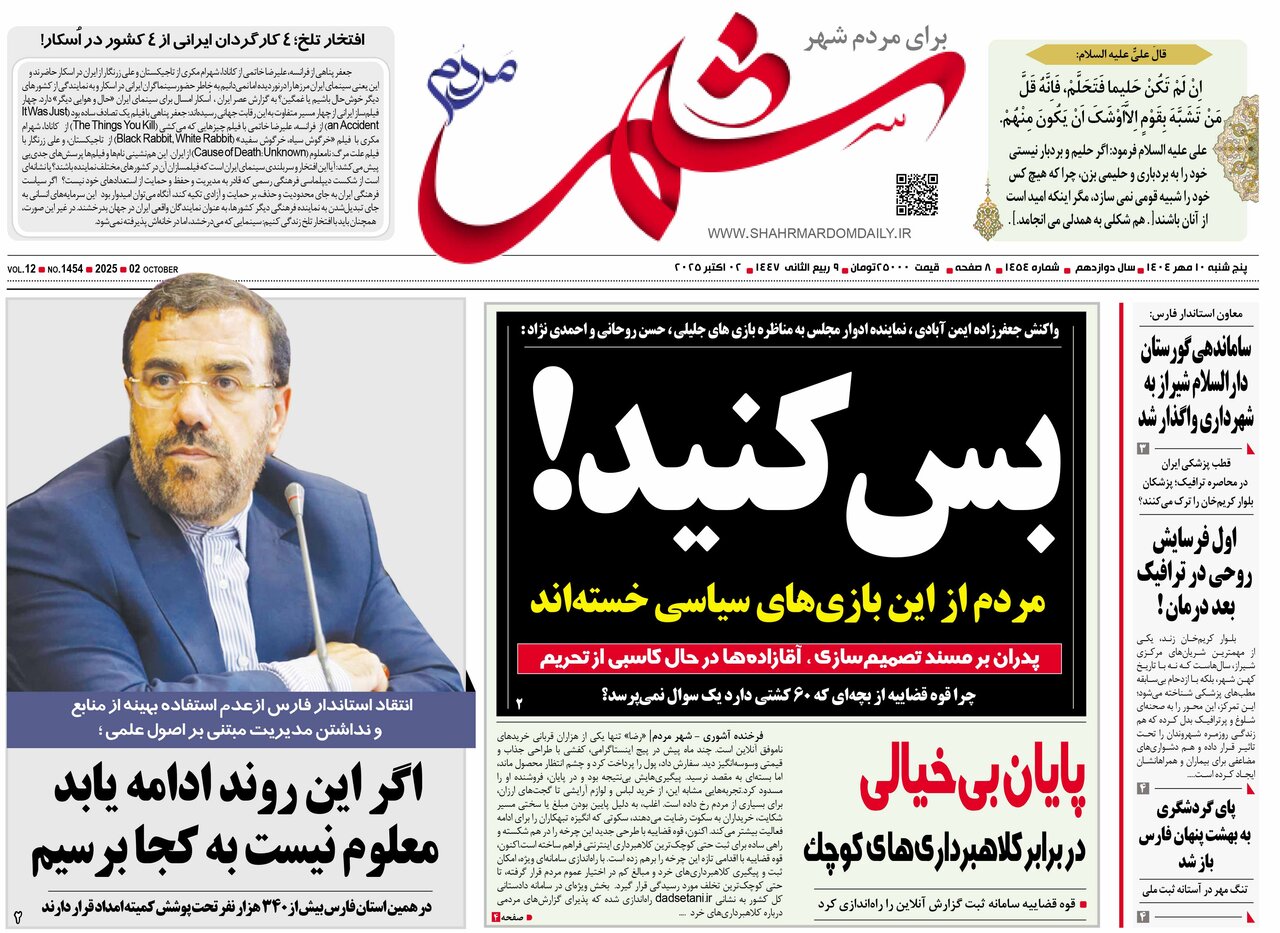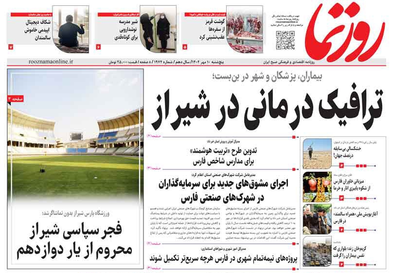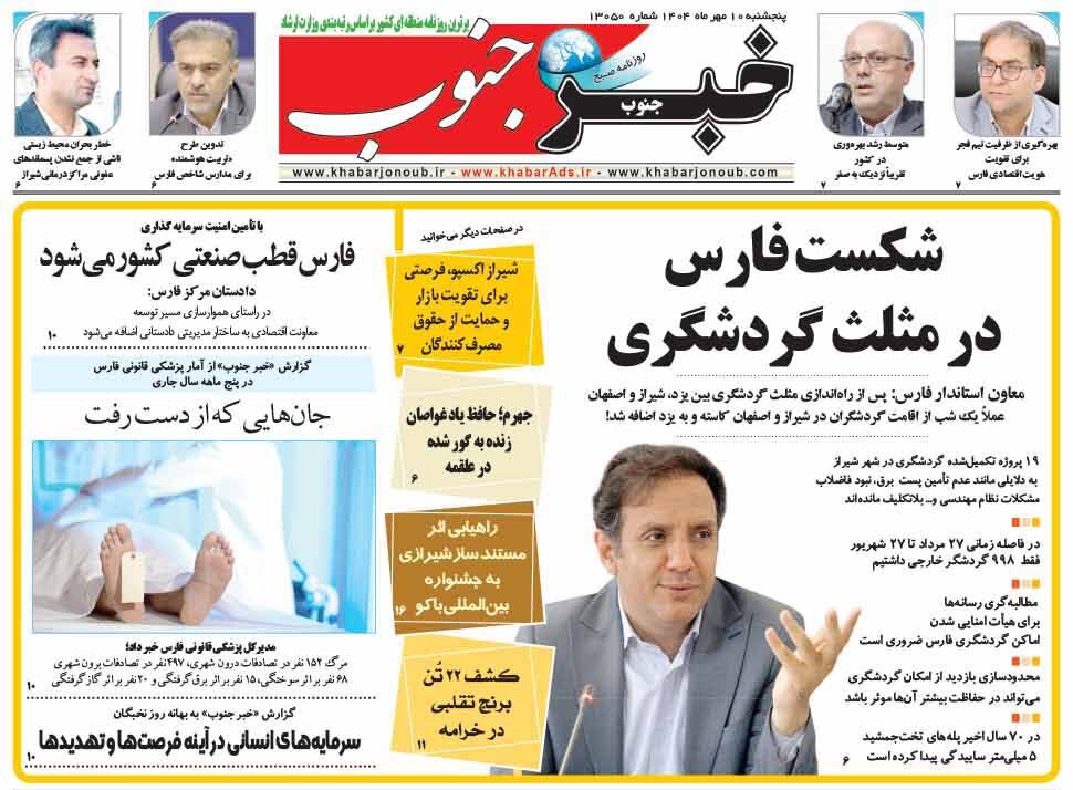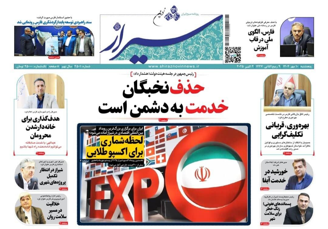 صفحه نخست روزنامه های استان فارس پنجشنبه ۱۰ مهرماه