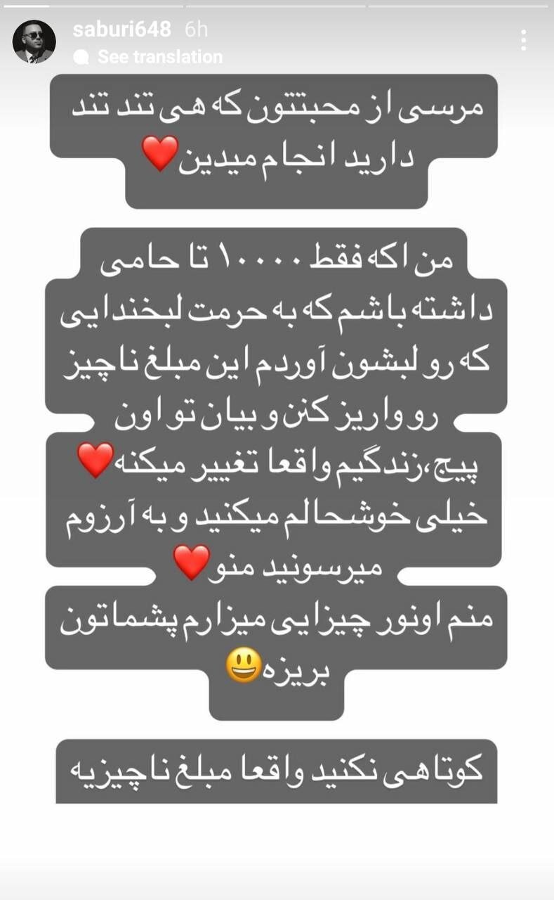 علی صبوری استوری گذاشته هرکی میخواد پیج جدیدمو فالو کنه ۲۰۰ هزار تومن باید واریز کنه میخوام ماشین بخرم!
